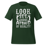 Step into the surreal with the "Whose Afraid of Reality" T-Shirt from B&R Fashion LLC. This dark green tee features distressed white graphic hands and bold text that reads: